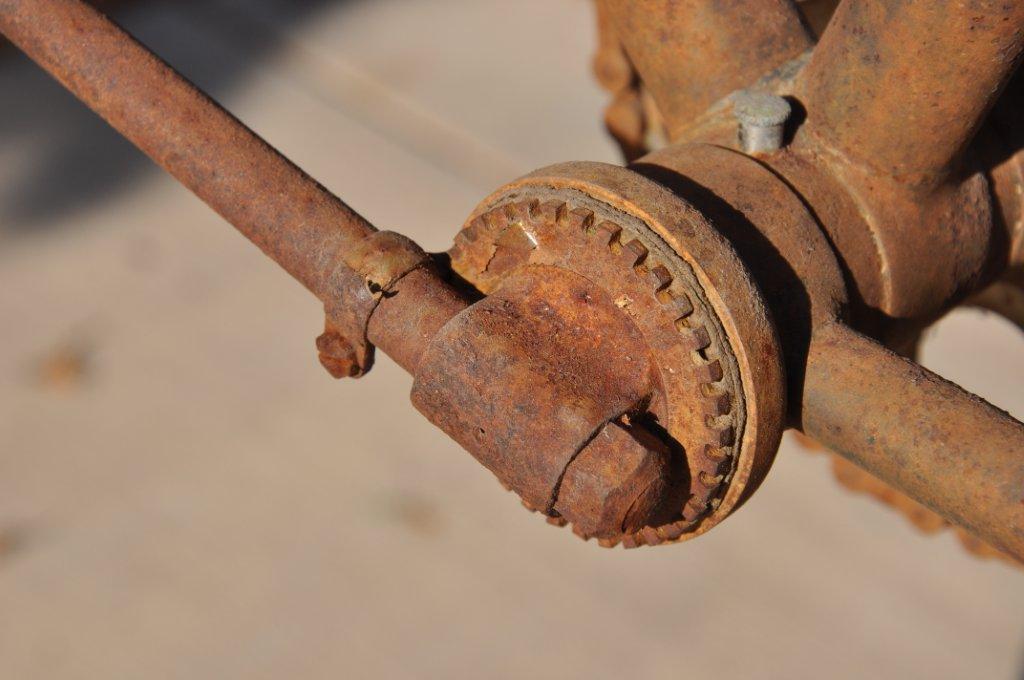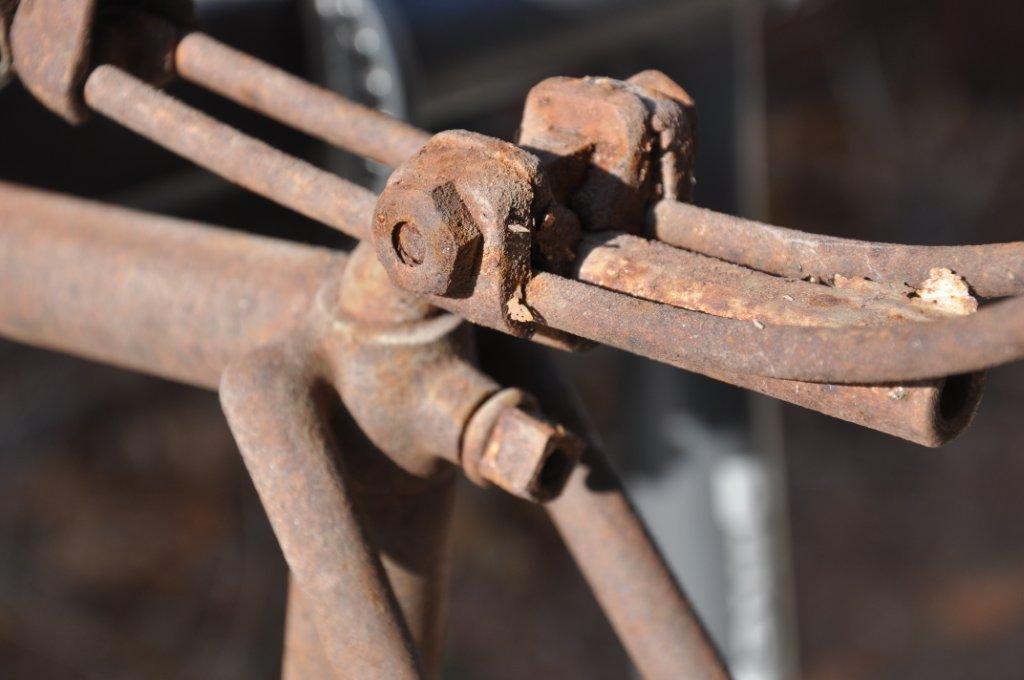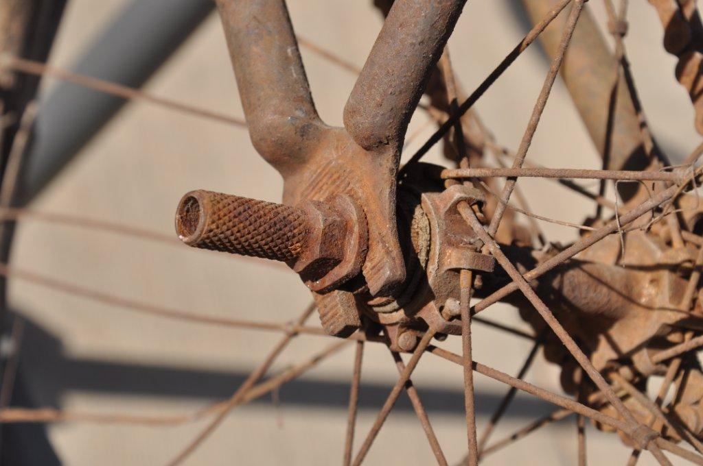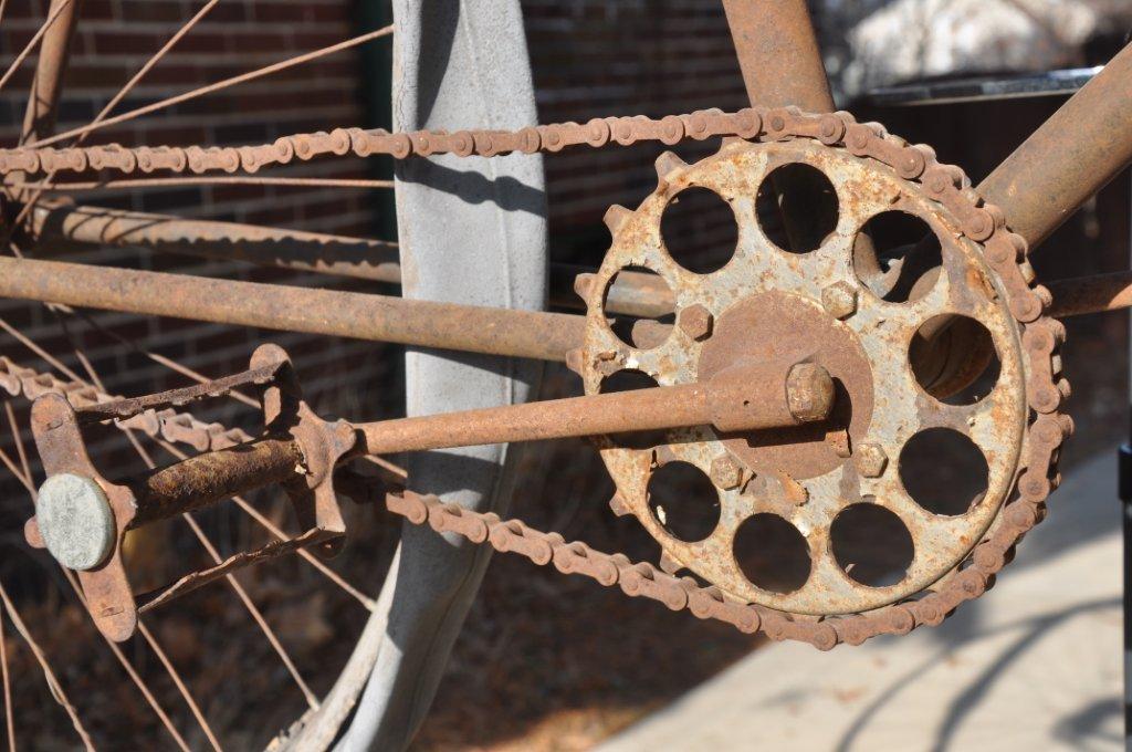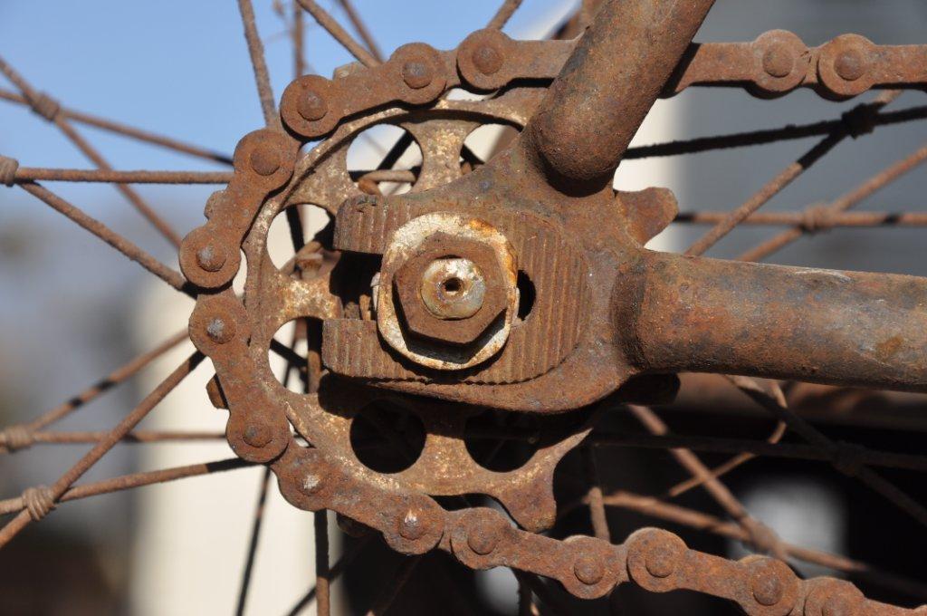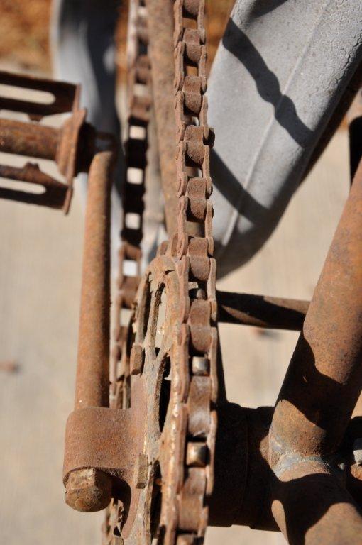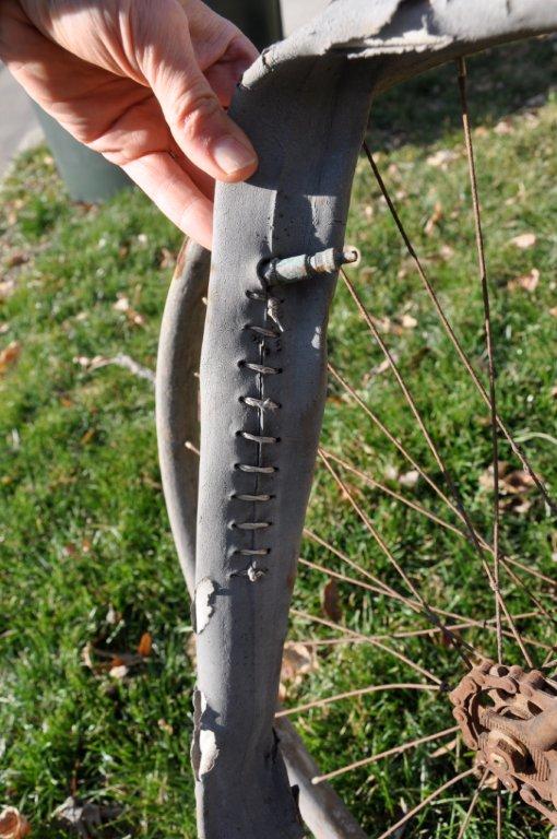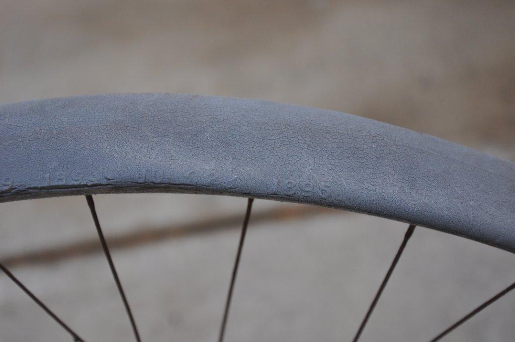 Look at all the beautiful details on this rusty gem, like the tires from 1895 on wooden rims!